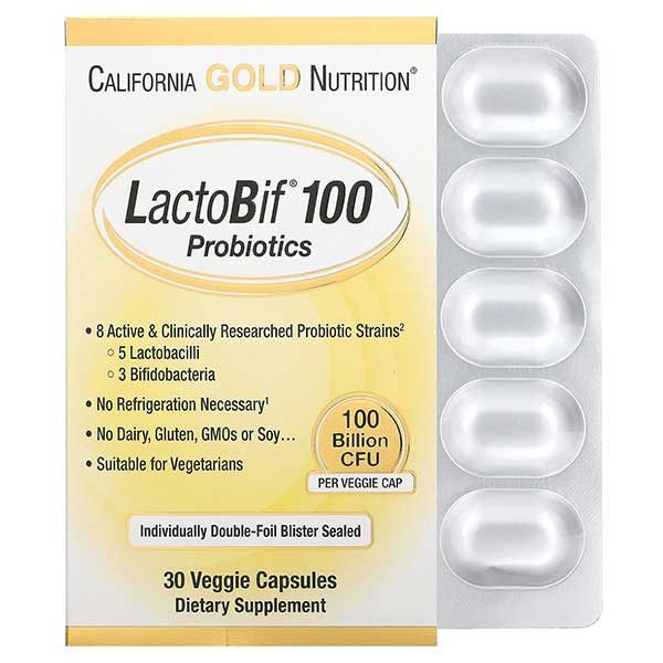 California Gold Nutrition Lactobif® 100 Probiotics contain 8 active probiotic strains, including 5 Lactobacilli Bacteria and 3 Bifidobacteria. Each veggie capsule contains 100 billion CFU to deliver an effective number of good bacteria to the body.